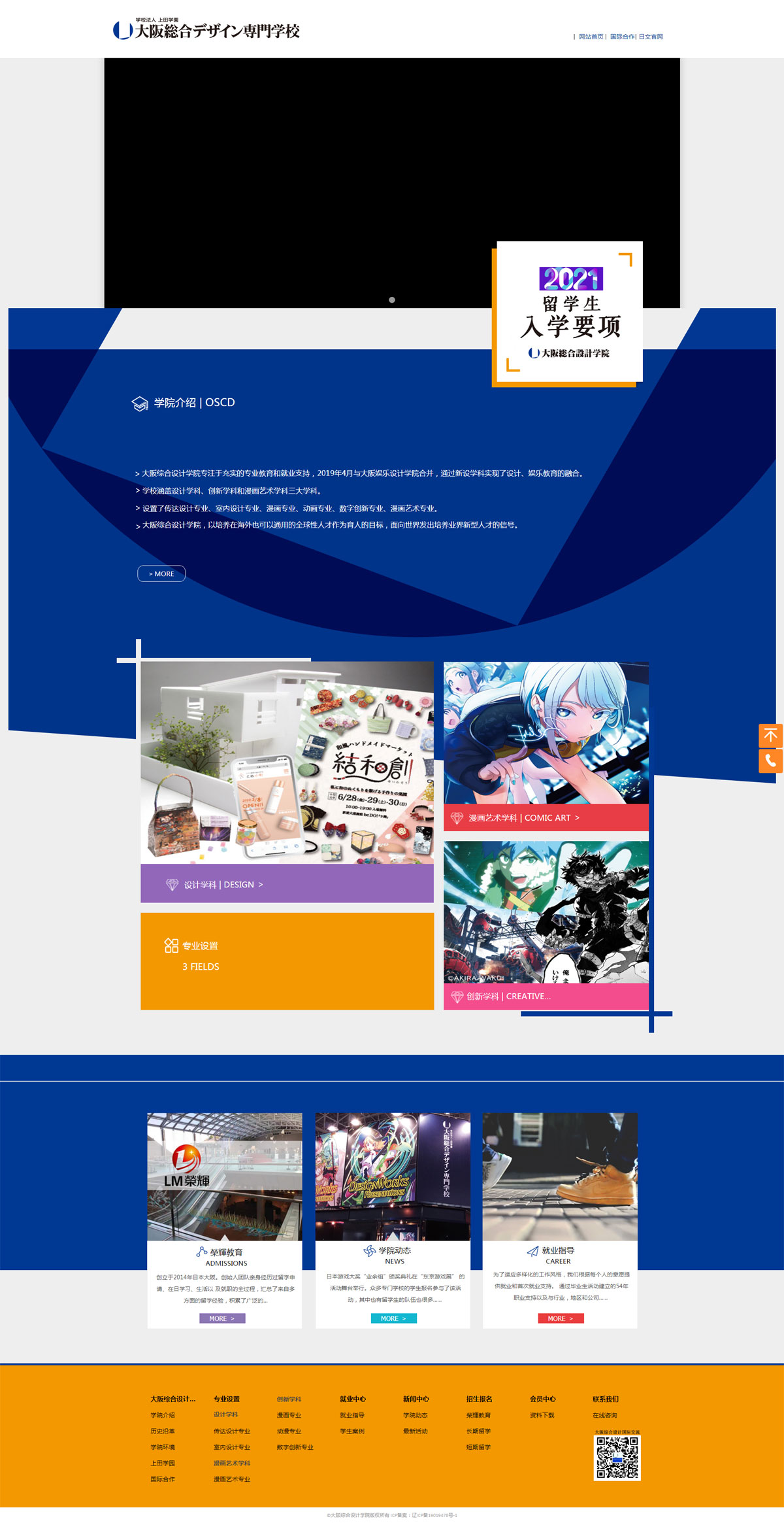 学院专注于坚实的专业教育和就业支持,2019年与大阪娱乐设计学院合并,通过新设学科实现了设计、娱乐教育的融合。并从2020年起将紧随时代潮流和创新要求,整合创建全新的教育践习体系。学院目前设有:设计、创新和漫画艺术三大学科;分设:传达设计、室内设计、漫画、艺术插画、手办模型制作、动漫、游戏和漫画艺术等8门专业,可谓囊括时下热门且颇具就业竞争力和市场发展前景的文创设计领域的学科和专业。
