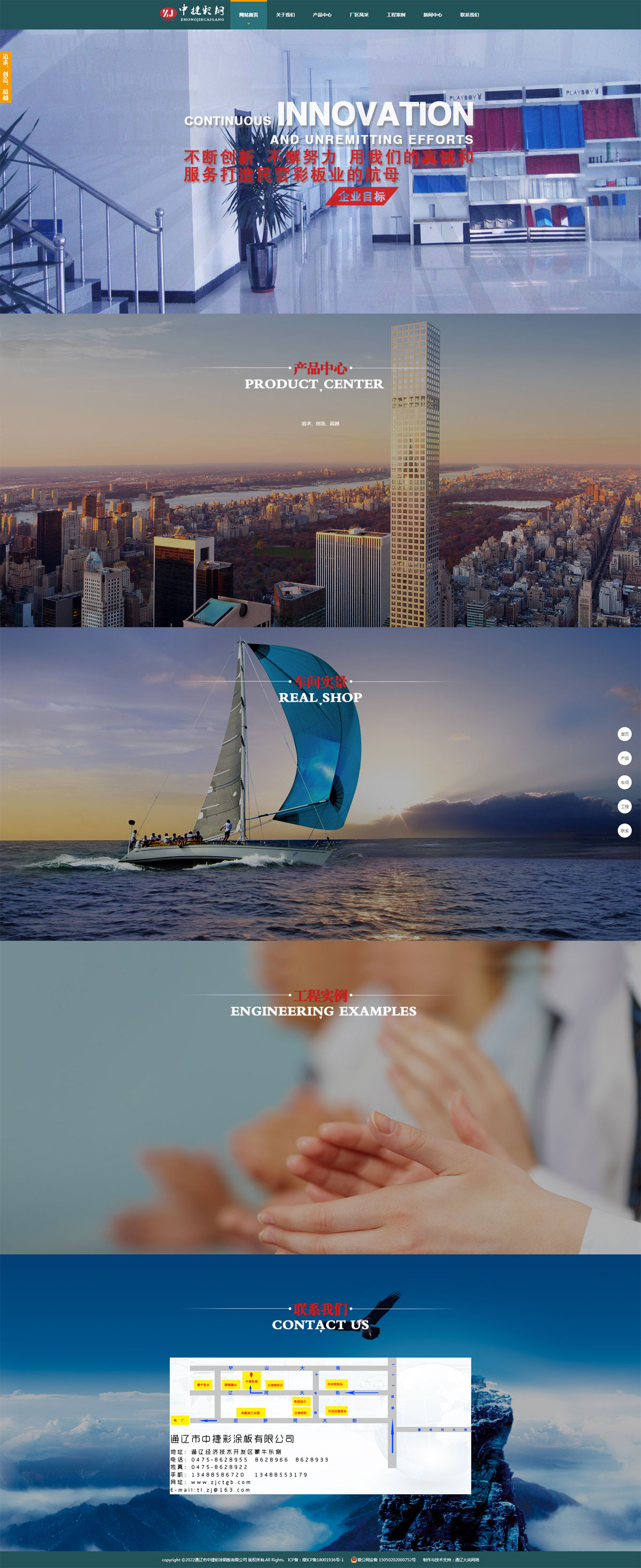 通辽市中捷彩涂钢板有限公司坐落于通辽经济技术开发区,公司注册资金800万元,占地面积120亩,钢结构生产车间10600平米,办公大楼 2500平米。现有彩板及全自动C型钢生产设备生产设备十二条,国内先进的钢结构生产线机组二十余组,年生产能力达2万余吨。是通辽地区集钢结构厂房设 计、制作、施工为一体的专业公司。通辽中捷公司始终坚持以品质求发展,以诚信赢市场的经营方针,在短短几年时间,即赢得了客户们的一致认可和称赞,并连续 五年被通辽市建设工程质量监督造价管理站认定为建筑材料造价的指定参考标本。“中捷彩钢”也成为通辽地区的知名品牌“中捷人”坚持“以人为本,客户至上、 坚守诚信”的经营方针,打造了今天辉煌的“中捷”。明天,我们将迎接更大的挑战,继续领跑彩钢行业,努力把“中捷”打造为民营彩钢的航母。中捷公司全体员 工欢迎各届新老朋友来公司洽谈业务。
